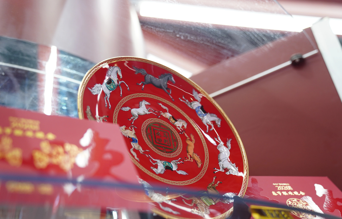 إحدى الأطباق الخزفية من هذه السلسلة معروضة في المتجر المؤقت يحمل طابع احتفالات مهرجان الربيع في محطة مترو قانغشيا الشمالية في منطقة فوتيان.