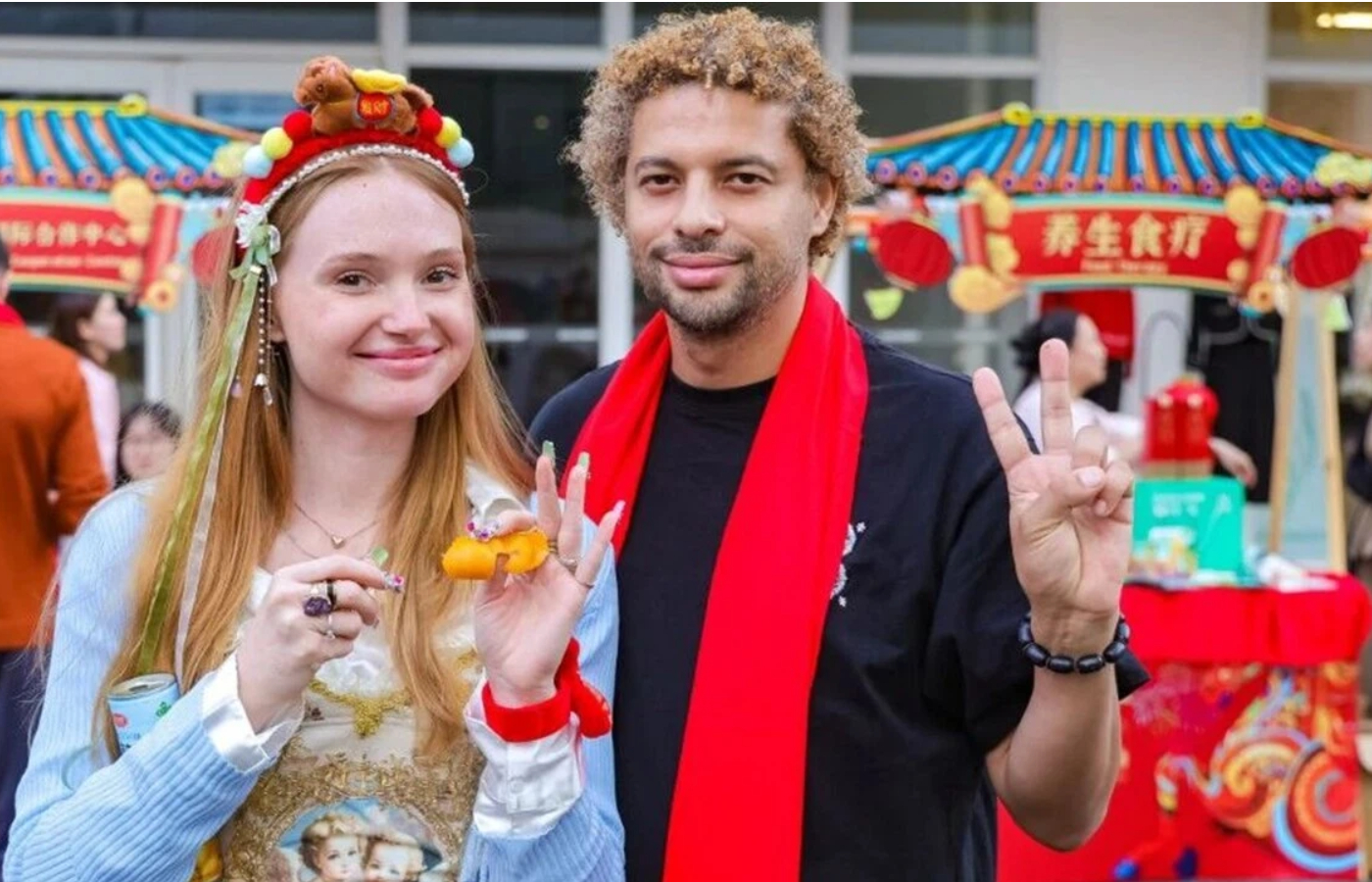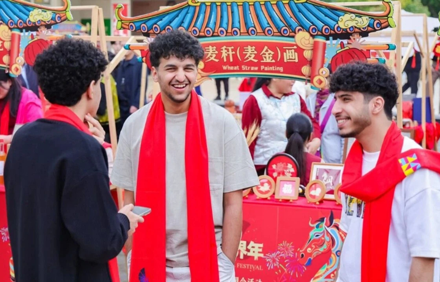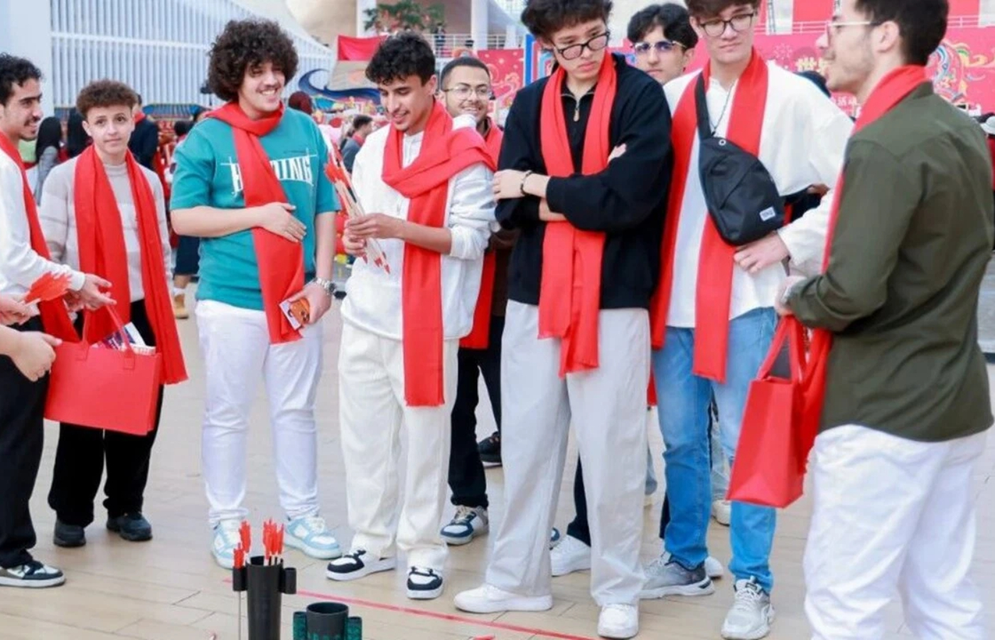 يضحك المقيمون الدوليون الذين يرتدون أوشحة حمراء احتفالية، ويلعبون الألعاب التقليدية، ويستكشفون الأكشاك الثقافية خلال احتفال " رأس السنة الصينية الجديدة، المهرجان العالمي " في منطقة لونغهوا في 12 فبراير.